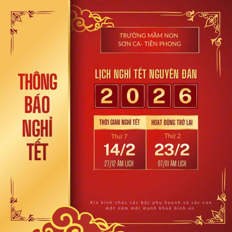 Nhân dịp Tết Nguyên Đán 2026, Trường Mầm non Sơn Ca – Tiền Phong trân trọng thông báo lịch nghỉ Tết như sau: