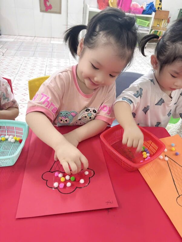 Hoạt động không chỉ giúp trẻ phát triển kỹ năng vận động tinh, mà còn khơi dậy sự sáng tạo, ham học hỏi và tạo cơ hội cho các bé thể hiện bản thân. Sau buổi học, các bé còn hào hứng khoe sản phẩm của mình với cô và các bạn.